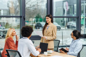 W eleganckim biurze trzy biznesmenki prowadzą ożywioną dyskusję przy stole konferencyjnym.