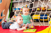 dwoje dzieci w pokoju zabaw z kulkami z tworzyw sztucznych