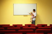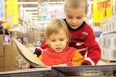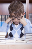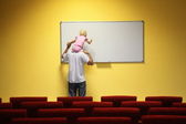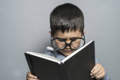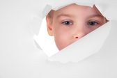 chłopak wygląda do otworu w arkuszu papieru z tekstem