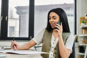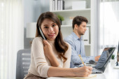 Zdjęcie "Młoda kobieta rozmawia przez telefon podczas gdy mężczyzna przegląda dokumenty w tętniącym życiem środowisku biurowym." może być wykorzystywane do celów osobistych i komercyjnych zgodnie z warunkami zakupionej licencji Royalty-free. Obraz jest dostępny do pobrania w jakości wysokiej rozdzielczości do 5760x3840.