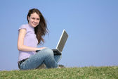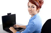 piękna dziewczyna posiada notatnik i naciśnij klawisz