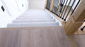 Pusty pokój z nowo zainstalowaną podłogą z winylu. Przestrzeń jest w trakcie remontu, z oknami pokrytymi taśmą zabezpieczającą i neutralnymi ścianami. Widok jest z korytarza, przez