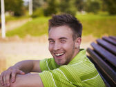 młody uśmiechnięty człowiek żółta koszulka na kładce