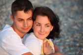 blondynka siedzi na kolanach chłopców na kładkę żółty
