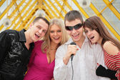 Zdjęcie "Grupa młodych usuwa się do kamery wideo na kładce" może być wykorzystywane do celów osobistych i komercyjnych zgodnie z warunkami zakupionej licencji Royalty-free. Obraz jest dostępny do pobrania w jakości wysokiej rozdzielczości do 5760x3840.