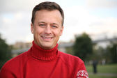 szczegół uśmiechnięty mężczyzna w niebieskim swetrze