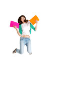 młoda kobieta siedzi na podłodze z trzech wielobarwnych arkuszy papieru