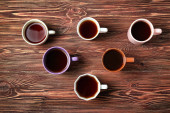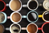 Wiele filiżanek kawy na drewnianym stole tło, widok zbliżenie