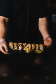Młoda kobieta jedząc sushi burger z pałeczkami podczas siedzenia w pozycji lotosu. Japońskie jedzenie. Sushi burger w rękach