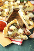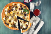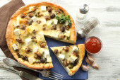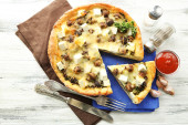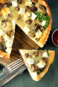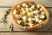 Sernik z grzybów, ziół i krem kwaśny, na maty wiklinowe, na tle drewniany stół