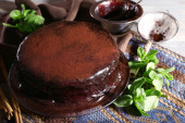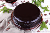 pyszne ciasto czekoladowe z polewą w talerz na stole, zbliżenie