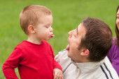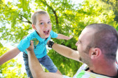 dziecko siedzi na ramiona ojca z mniszka lekarskiego