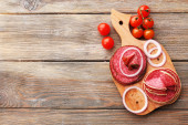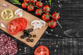 składniki do gotowania pizza na drewnianym stole, widok z góry