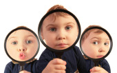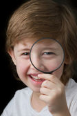 chłopak patrzy przez szkło powiększające z zainteresowaniem