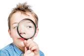chłopak patrzy przez szkło powiększające z zainteresowaniem