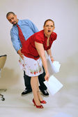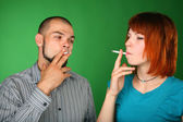 dziewczyna z Rude włosy wieje baniek mydlanych, a facet patrzy na to