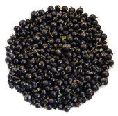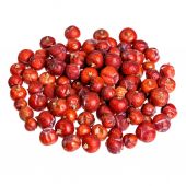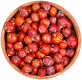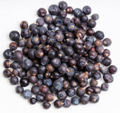 Suszone jagody jałowca w mały drewniany łuk na białym tle.