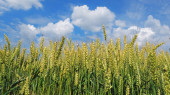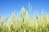 dojrzałej pszenicy łodygi i uszy zbliżenie przeciw błękitne niebo