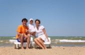 matki z dziećmi, stojąc w wodzie przy brzegu morza