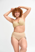 Młoda łysa kobieta w żywym ubraniu stoi pewnie, wykonując śmiałą pozę w studiu.
