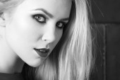 Zbliżenie portret seksowny młoda kobieta z piękne niebieskie oczy i czerwone usta na szarym tle