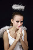 Dziewczyna w stroju anioła wygląda na otwartej dłoni