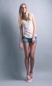 Ekspresyjny młody model w kolorze sukni na szarym tle