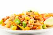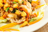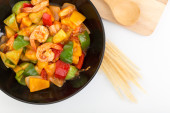 Opiekanymi mieszane warzywa i krewetki z sosem pomidorowym