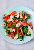 Zdjęcie "Piersi, rakiety, ogórek i pomidor sałatka z kurczakiem " może być wykorzystywane do celów osobistych i komercyjnych zgodnie z warunkami zakupionej licencji Royalty-free. Obraz jest dostępny do pobrania w jakości wysokiej rozdzielczości do 5760x3840.