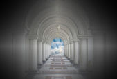 Piękny przepięknym łukowym chodnik z błękitne niebo i cloun