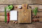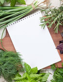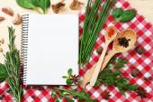 Otwórz książkę kucharską z świeżych ziół i przypraw na drewniane tła