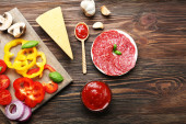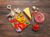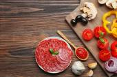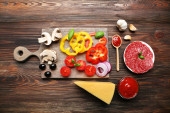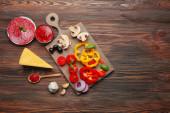 składniki do gotowania pizza na drewnianym stole, widok z góry