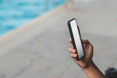 człowieka, który robi zdjęcia krajobrazu. Używa kamery komórkowej. ustawione w jasnej, naturalnej atmosferze po południu.