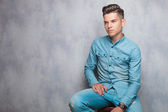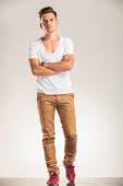 widok z boku zrelaksowany człowiek dorywczo ręką za kark