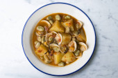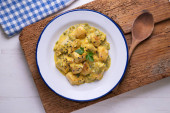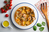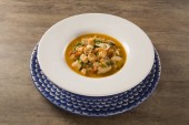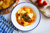 Gulasz sardynkowy z ziemniakami i porami. Top widok tabeli z dekoracjami.