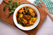 Zdjęcie "Gulasz sardynkowy z ziemniakami i porami. Top widok tabeli z dekoracjami." może być wykorzystywane do celów osobistych i komercyjnych zgodnie z warunkami zakupionej licencji Royalty-free. Obraz jest dostępny do pobrania w jakości wysokiej rozdzielczości do 5760x3840.