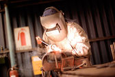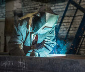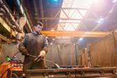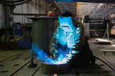 człowiek z maski ochronne spawalnicze w fabryce