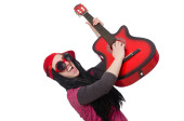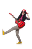 Młoda optymistyczna dziewczyna trzyma gitarę izolowane na białym
