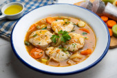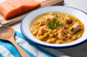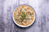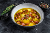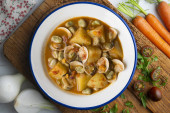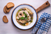 Kastylijska zupa z warzywami, grzankami chlebowymi i jajkiem. Top widok tabeli z dekoracjami.