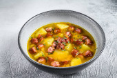 Zdjęcie "Kastylijska zupa z warzywami, grzankami chlebowymi i jajkiem. Top widok tabeli z dekoracjami." może być wykorzystywane do celów osobistych i komercyjnych zgodnie z warunkami zakupionej licencji Royalty-free. Obraz jest dostępny do pobrania w jakości wysokiej rozdzielczości do 5760x3840.