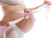 kobieta w ciąży z niebieską wstążką na brzuch na białym tle