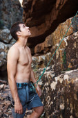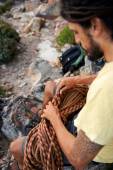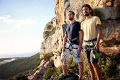 Dwóch mężczyzn przytrzymanie skała sprzęt wspinaczkowy