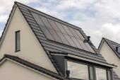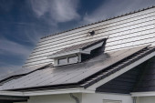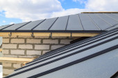 Zdjęcie "Close-up dom retro panel dachowy ze stojącym szwem i zapięciami. Klasyczny czarny metalowy panel z przegubem rabatowym. Nowoczesna blacha stalowa ocynkowana z żebrami. Dachówki Falz. Budynek zabezpieczony." może być wykorzystywane do celów osobistych i komercyjnych zgodnie z warunkami zakupionej licencji Royalty-free. Obraz jest dostępny do pobrania w jakości wysokiej rozdzielczości do 5760x3840.