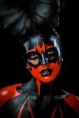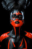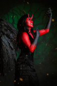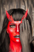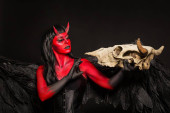 Oszałamiająca kobieta obejmuje ducha Halloween w śmiałym stroju czerwonego diabła, wraz z rogami.