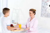 Mały chłopiec i jego matka dzielą serdeczne śniadanie wypełnione wizualną komunikacją..