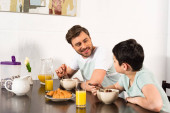 Zdjęcie "Mały chłopiec i jego matka dzielą serdeczne śniadanie wypełnione wizualną komunikacją.." może być wykorzystywane do celów osobistych i komercyjnych zgodnie z warunkami zakupionej licencji Royalty-free. Obraz jest dostępny do pobrania w jakości wysokiej rozdzielczości do 5760x3840.