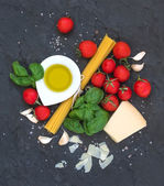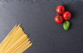 Rama żywności. Składniki makaron. Pomidory cherry, makaron spaghetti, czosnek, bazylia, parmezan i przyprawy na ciemne tło tapeta, miejsce