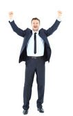jeden bardzo zadowolony energiczny biznesmen z uniesionymi ramionami