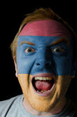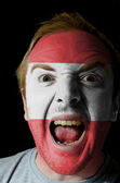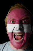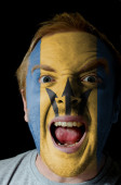 twarz szalony człowiek zły pomalowane w kolorach flagi szwajcarskiej
