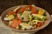 ryba sałatka z jaj przepiórczych, słodka papryka i świeże zioła